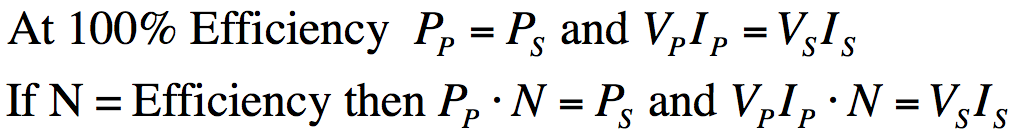 If it weren’t for the losses discussed above, the power in the primary would equal the power in the secondary or we say that the ideal transformer is 100% efficient. However, transformers aren’t ideal and they aren’t 100% efficient.