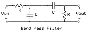 The Band Pass Filter allows a small window of frequencies to pass through and blocks all frequencies above and below this window. The Band Pass Filter is just a simple combination of the Low Pass and High Pass filters. The corner frequency of the low pass filter must be chosen high than the frequency of the high pass filter. The same equation applies to determine each corner frequency.