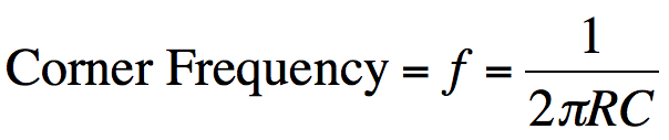 A Band Reject Filter will reject all frequencies in a window and allow all frequencies greater or lesser than the window to pass. The center of the reject window is determined by the corner frequency equation from the low pass or high pass filter.