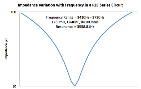 In this situation, the frequencies near resonance are not affected by the reactance in the circuit but when the frequencies are far away from resonant frequency the impedance is much higher and they are affected greater. These component values could be used in a circuit to filter out all frequencies below 3500Hz and above 3600Hz.