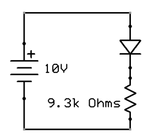 Answer:  We know that the voltage drop across the diode is 0.7 volts therefore using Kirckoff’s voltage law for series circuits we can say that the voltage drop across the resistor is 10V-0.7V=9.3V.  Since we know the voltage across the resistor and the resistance we can use ohm’s law to determine the current, I=9.3/9300 = 1mA