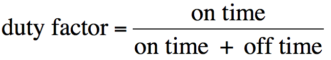 Previously we discussed that the speed of a DC motor is dependent on the voltage at its terminals.  In order to automatically control the DC voltage to our motor we could use a complicated DC power supply with a voltage control input.  However, the easy way is to create a square wave at a constant frequency with a varying duty cycle.  The duty cycle of a square wave is a ratio of the on time versus the total time of the period.  A square wave with equal on time and off time is said to have a duty cycle or duty factor if 1/2.  Likewise, a square wave with a on time of 1mS and a off time of 3mS is said to have a duty factor of 1/4.  The equation to find the duty cycle or factor of a square wave is given below.