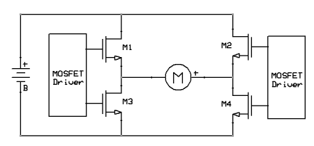 One additional, typically unforeseen, issue with this circuit is the inability for a simple circuit to turn on and off transistors M1 and M2.  These are called high side switches because they are connected to the highest voltage in the circuit.  Because the driver must insure that the gate to source voltage is at least 4V the voltage between the gate and ground is much higher than 4V.  This requires a special driver called a high side driver.  These drivers are, many times, package together with a “low-side” driver such that the combination is able to turn on and off all four (or at least two) transistors inside one chip.