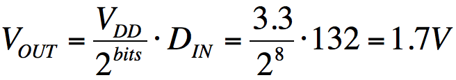 The following equation characterizes the DAC. If the DAC is referred to as an 8-bit DAC, it converts the digital value into one of 256 voltages between 0 and VDD. If the power supply voltage, VDD, is 3.3V and its digital input is 132, the output voltage is 1.7V.