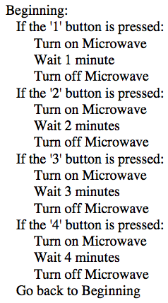For example in order to run a very simple microwave, a microcontroller could have the following program.