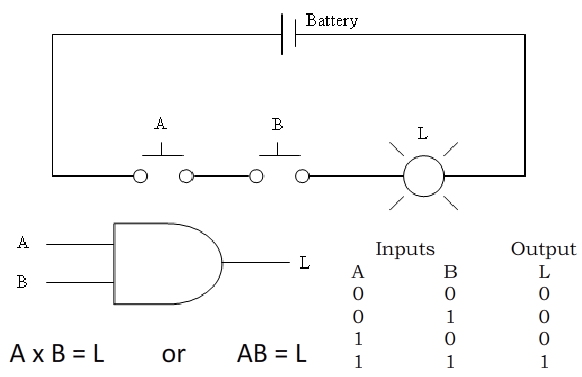 The AND gate follows the rule, “If input A AND input B are both a 1 then the output is a 1 otherwise the output is a 0.” The AND gate can have more than two inputs. When it does, all inputs must be a 1 before the output is a 1. (Audio)