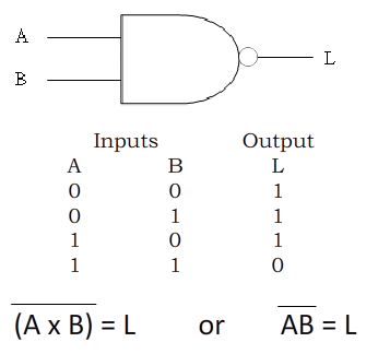 The NAND gate follows the rule based on where it gets its name, NOT AND. “If both inputs are a 1 then the output is a 0, otherwise the output is a 1.” The NAND gate can have more than two inputs. When it does the output will be a 1 unless all inputs are a 1. (Audio)