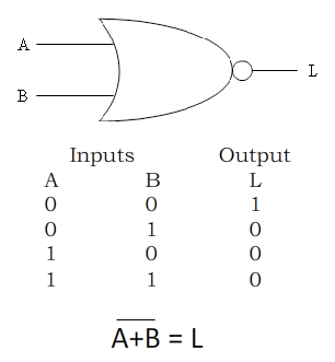 The NOR gate follows the rule based on where it gets its name, NOT OR. “If either input A OR input B is a 1 then the output is a 0, otherwise if both inputs are a 0 the output is a 1.” The NOR gate can have more than two inputs. When it does the output will be a 0 unless all inputs are a 0. (Audio)