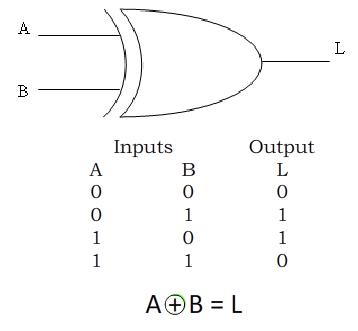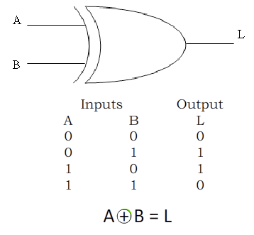 The XOR gate follows the rule based on where it gets its name, Exclusive OR. The XOR excludes one state from the OR gate, that is when both inputs are a 1, no longer is the output a 1 as it was in the OR gate but it is a 0. Therefore our rule for the XOR gate is, “If the two inputs differ, that is if one input is a 1 and the other is a 0, then the output is a 1 otherwise the output is a 0. The XOR can have more than two inputs but this is rare and is normally considered as a cascaded set of gates. When this occurs the output is a 1 when there are an odd number of inputs that are a 1 and a 0 when there are an even number of inputs that are a 1. (Audio)