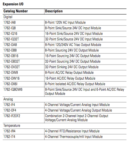 3. DC or AC – Inputs and outputs are sold as either direct current (DC) compatible or alternating current (AC) compatible. Some inputs and outputs can handle either AC or DC. Below is a list of available input and output sets available for the MicroLogix 1100 PLC we have in the lab. The MicroLogix 1100 is capable of handling four I/O expansion modules along with the fixed I/O.