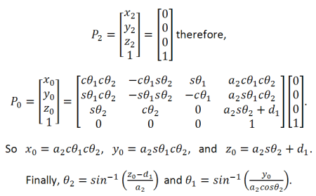 Now that we have the inverse kinematics solution we are able to solve for joint angles if given a required point in space with respect to the base coordinates.  For example, if in the given example above, it was necessary for the robot to travel to the point in space [x, y, z] = [ 136.151, 36.482, 151.303 ] and we measured d1 to be 100 mm and a2 to be 120 mm then we could solve for the joint angles by plugging in and solving for x, y, and z.