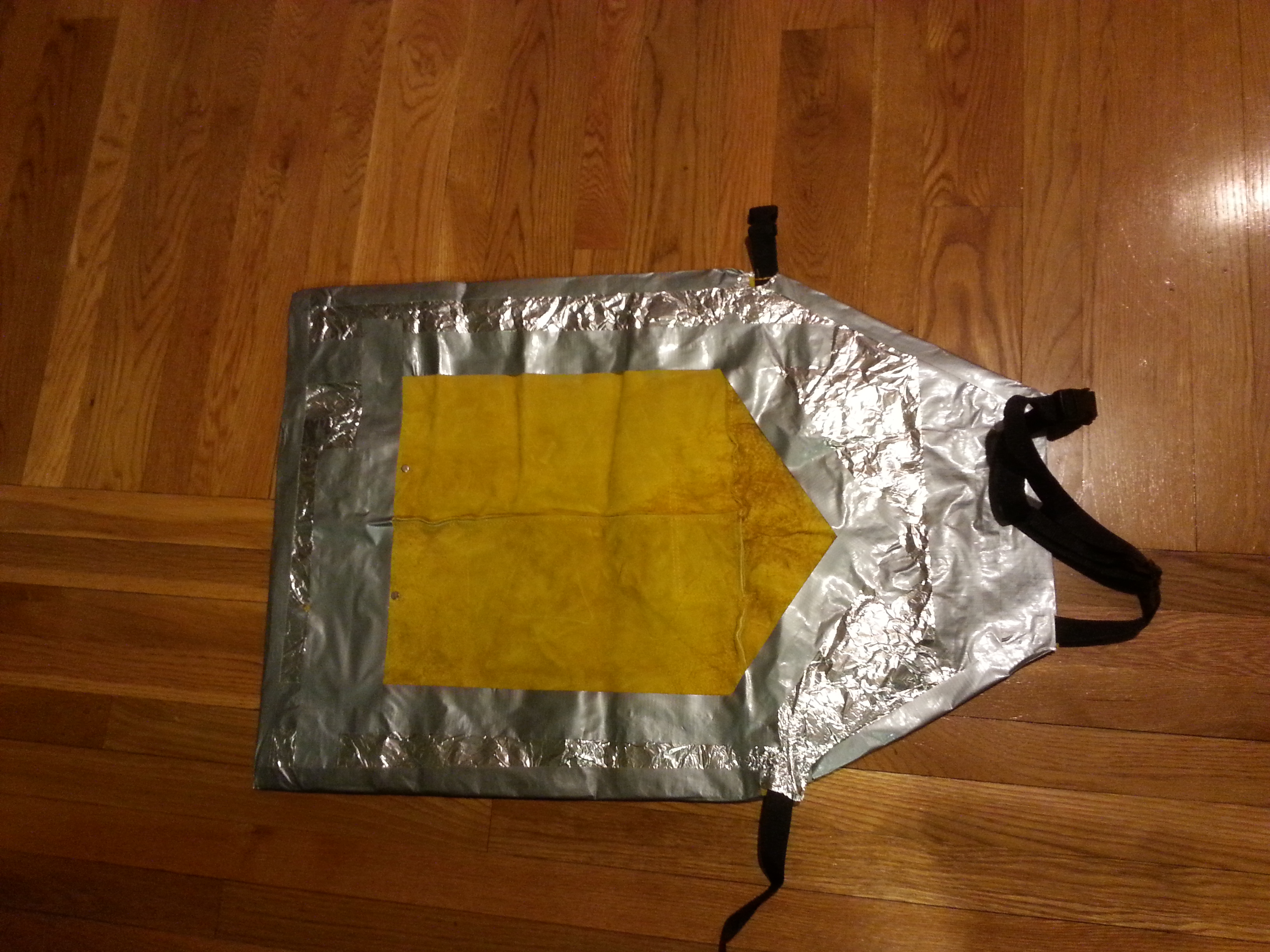 For radiant heat protection a welder’s helmet was used along with a very creative radiant shield apron. No radiant shield aprons were available locally so a leather welder’s apron was purchased and lined with aluminum foil! It did work just fine but ripped a few times. For the next time an aluminized apron and a full vision radiant face shield will be purchased.